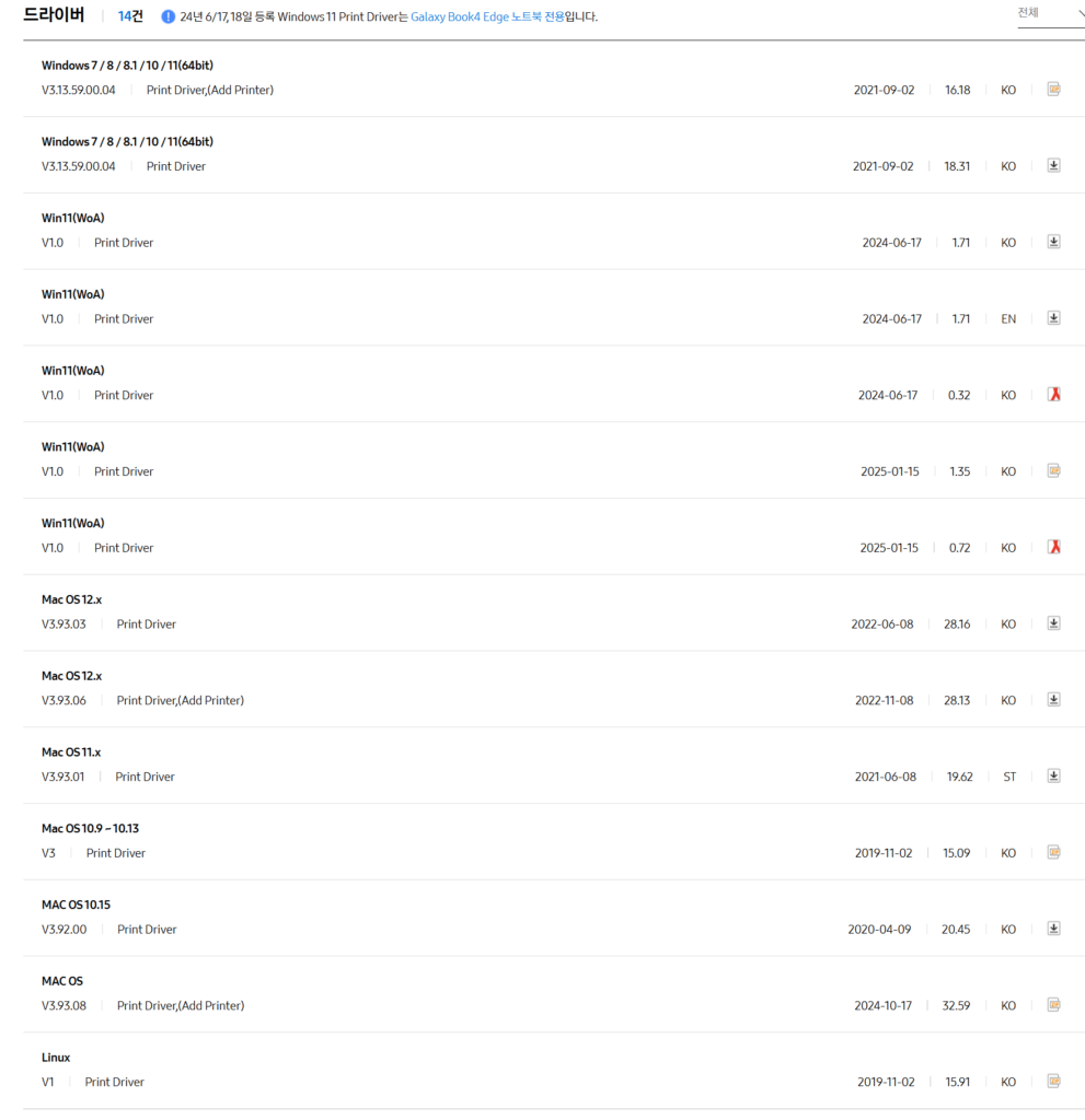 → 드라이버는 운영체제별로 따로 제공되므로, 반드시 해당 OS용 파일을 선택해야 합니다.